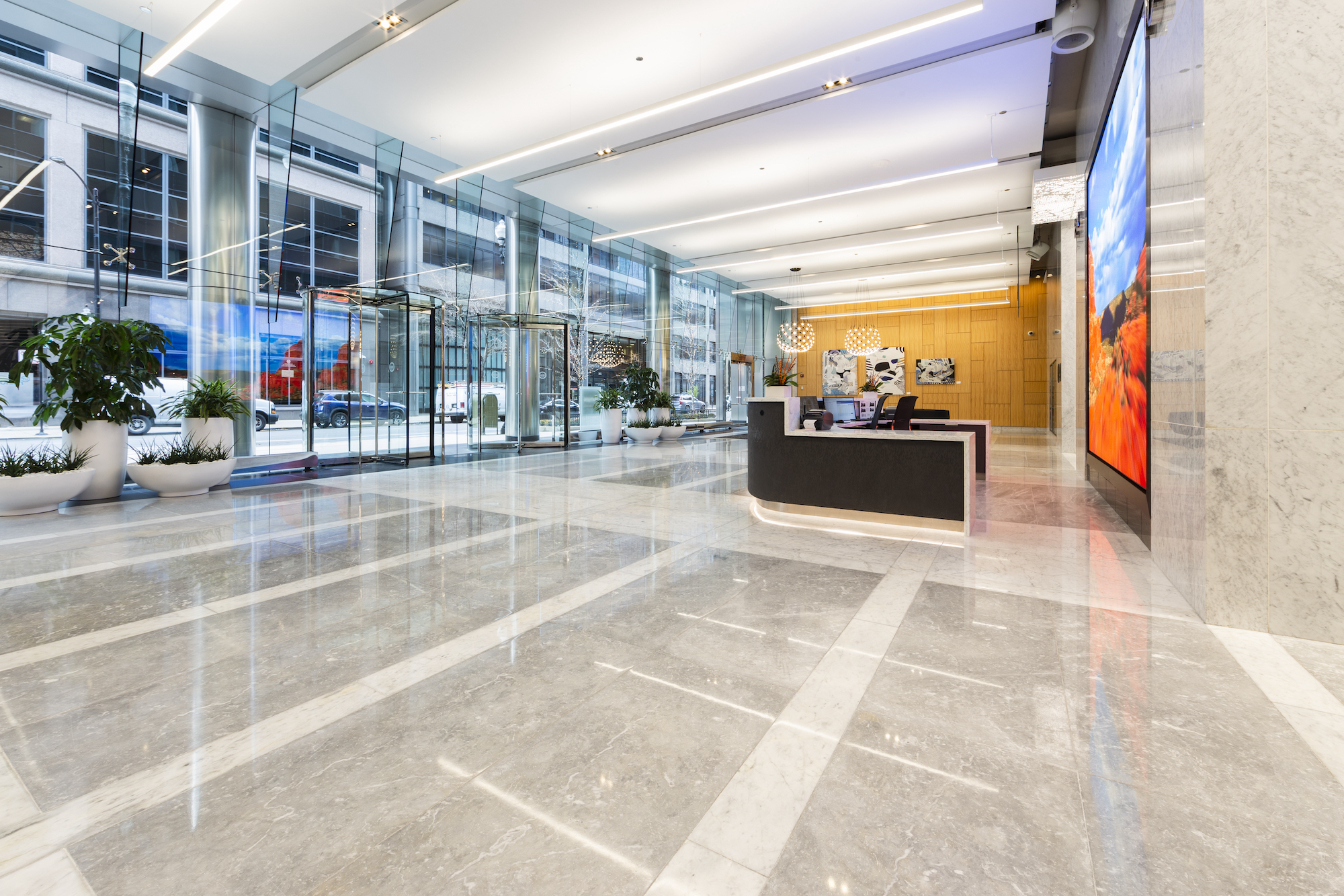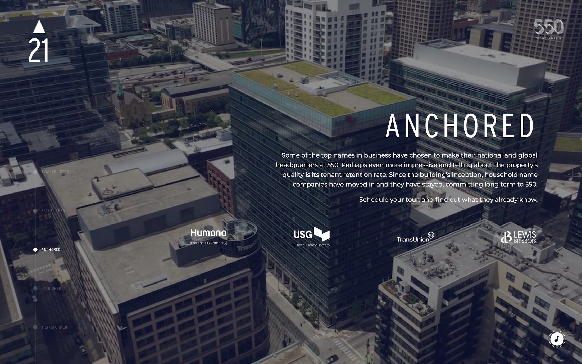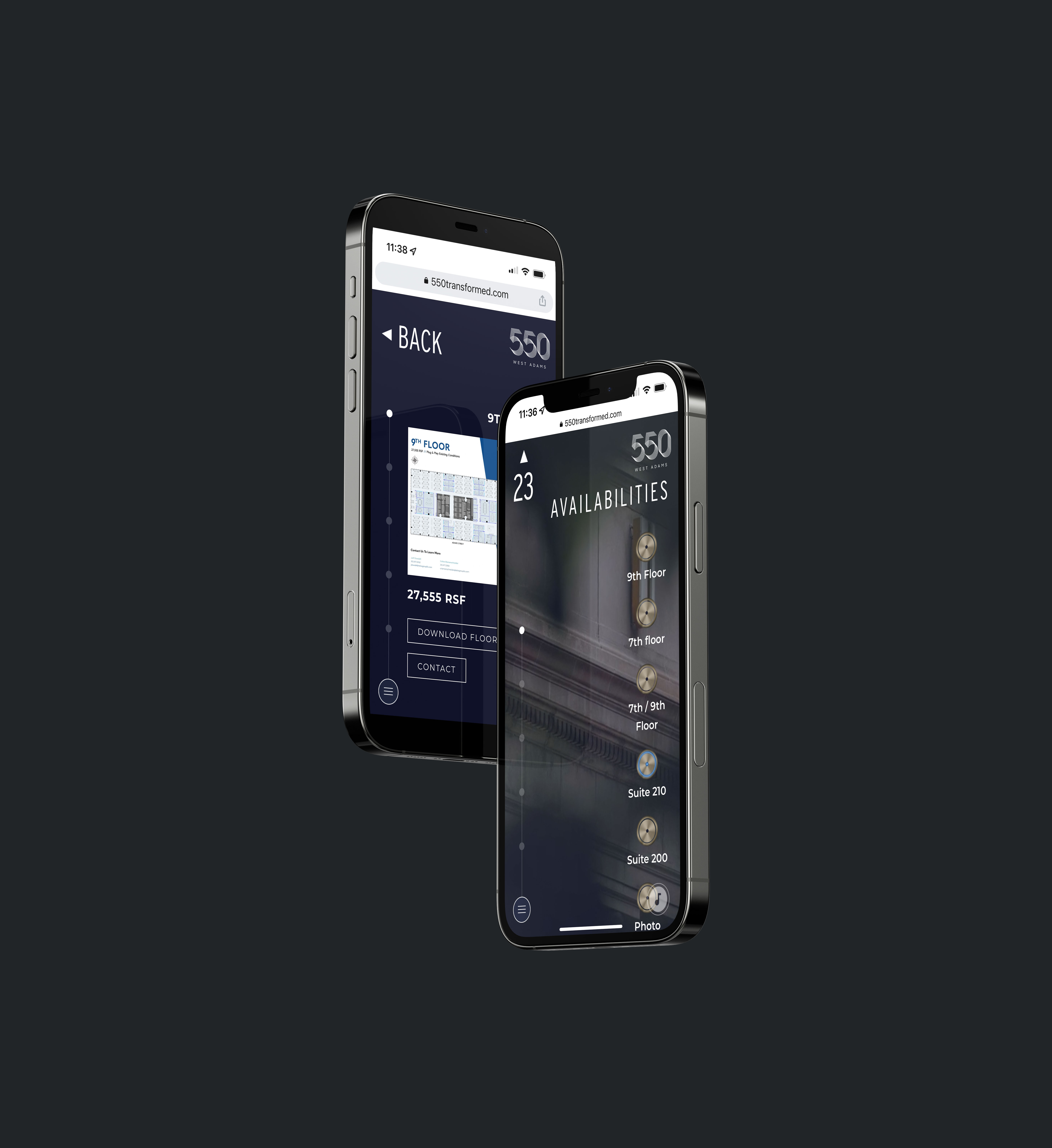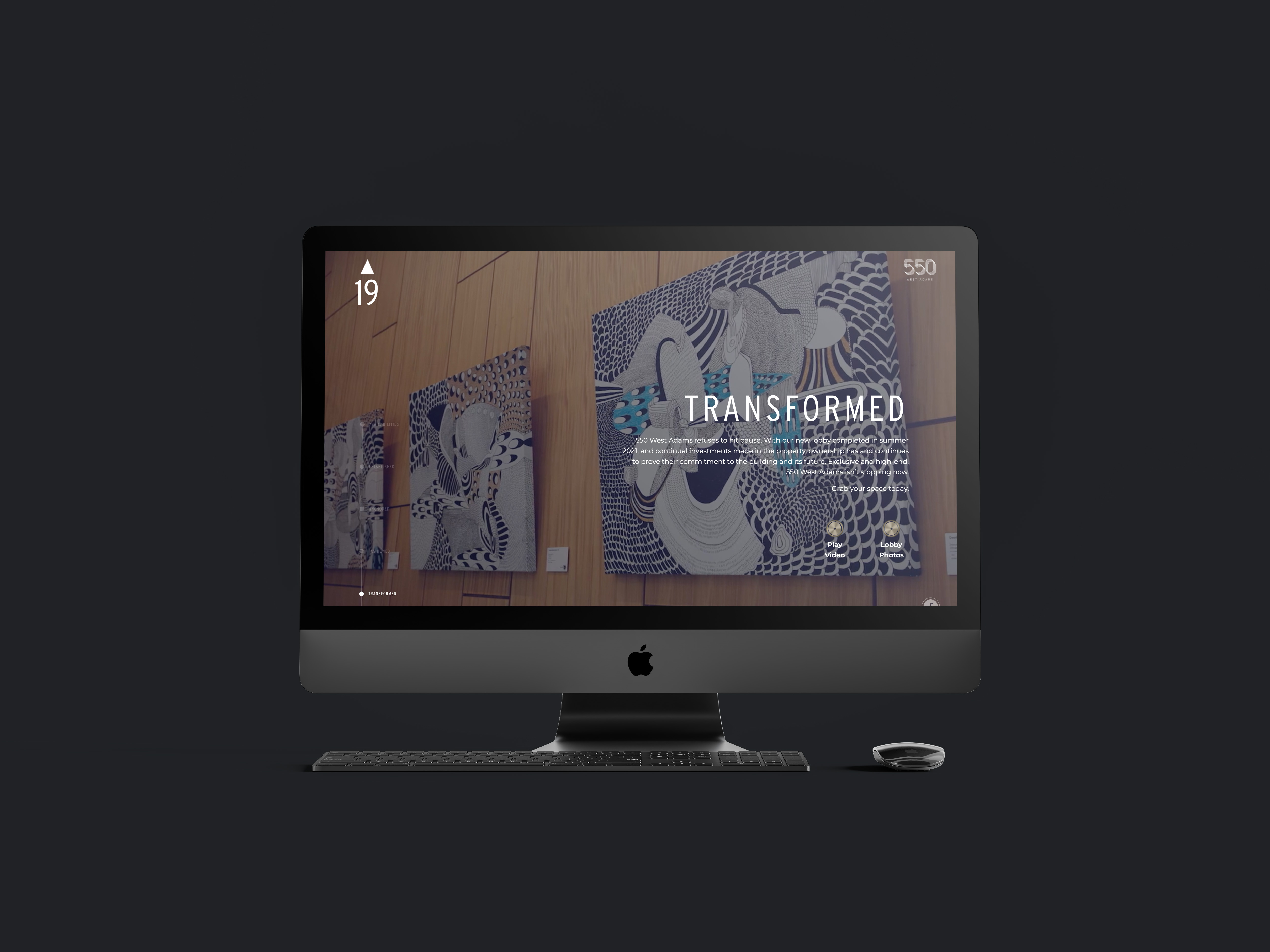 The ownership of 550 W Adams and Telos hired BOD to come up with a creative campaign to promote the property and its available spaces. To our advantage, ownership had just finished installing a set of new amenities and they were in the process of completing a full lobby renovation. After presenting multiple campaign ideas, the team landed on our “Elevator” concept. Uniquely, the website scrolls upward instead of the traditional downward scroll. The opening screen shows an activated elevator button, which then separates at the middle like doors to reveal the main campaign theme “550 Transformed”. Elevator themed elements continue throughout the site, including the option to have elevator music.